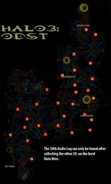 ODST Guide Audio Log Locations There are 30 Audio Logs to find. Just off the road on the north side. With Halo 3.